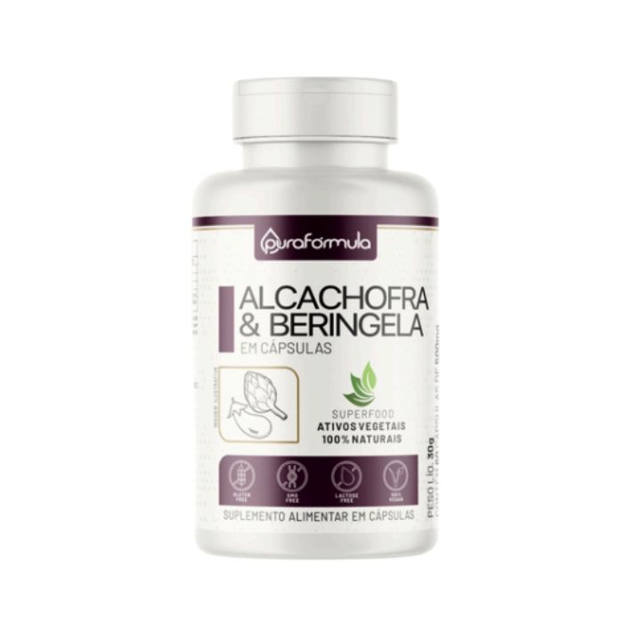 O Alcachofra + Beringela 500 mg da PURA FÓRMULA é composto por ingredientes de origem vegetal, apresentado em cápsulas práticas para o dia a dia.